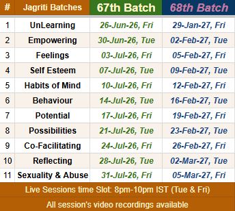 As of now, this is the slot (8pm to 10pm IST) we have for Jagriti – keeping all our commitments with children at Aarohi in mind. We request you to discuss with your family and empower your children to support you in attending during this time slot. It’s only twice a week (Tuesdays and Fridays), that too for just five weeks.